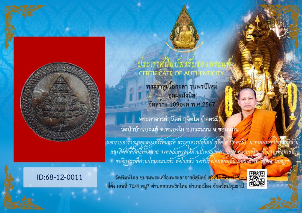 ID:68-12-0011 บัตร/鉴定卡/Card 09 ธ.ค. 2025 พระราหูเนื้อกะลา รุ่นพรปีใหม่ พระอาจารย์สุนิตย์ สุจิตโต (โคตรมี) วัดป่าบ้านบะแต้ จ.ขอนแก่น พ.ศ. 2567
