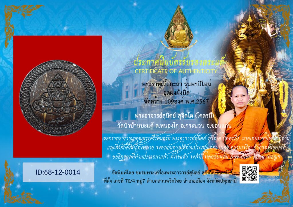 ID:68-12-0014 บัตร/鉴定卡/Card 09 ธ.ค. 2025 พระราหูเนื้อกะลา รุ่นพรปีใหม่ พระอาจารย์สุนิตย์ สุจิตโต (โคตรมี) วัดป่าบ้านบะแต้ จ.ขอนแก่น พ.ศ. 2567