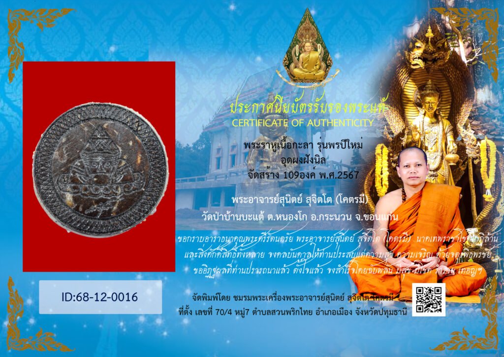 ID:68-12-0016 บัตร/鉴定卡/Card 09 ธ.ค. 2025 พระราหูเนื้อกะลา รุ่นพรปีใหม่ พระอาจารย์สุนิตย์ สุจิตโต (โคตรมี) วัดป่าบ้านบะแต้ จ.ขอนแก่น พ.ศ. 2567